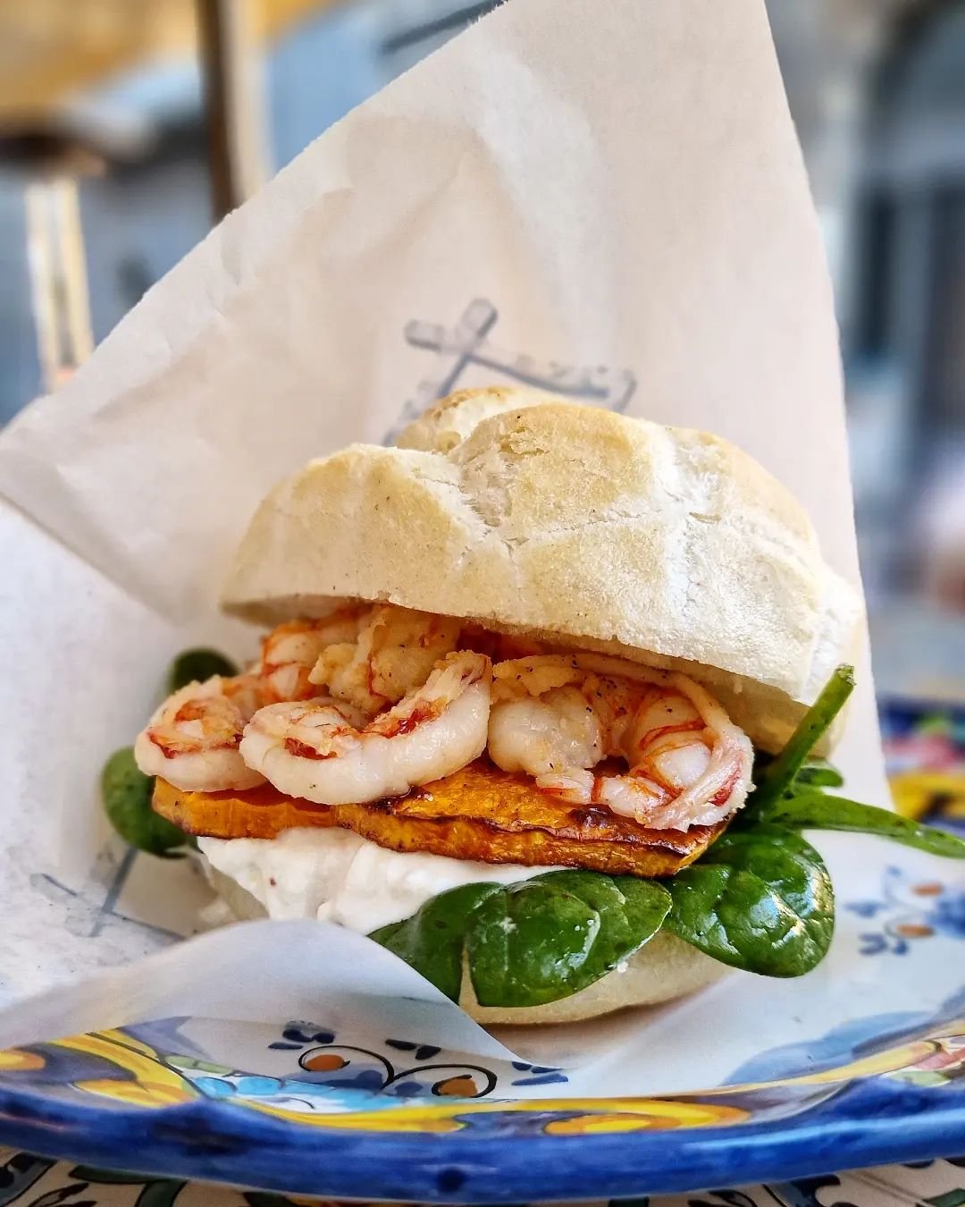 Gamberone scottato, mozzarella affumicata, scaglie di caciocavallo, pancetta croccante, crema di broccoli e salsa allo yogurt