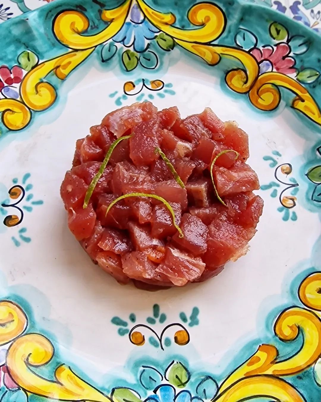 Tartare di tonno, burrata di Andria, pomodori confit, acciughe, capperi di Pantelleria e olio al basilico