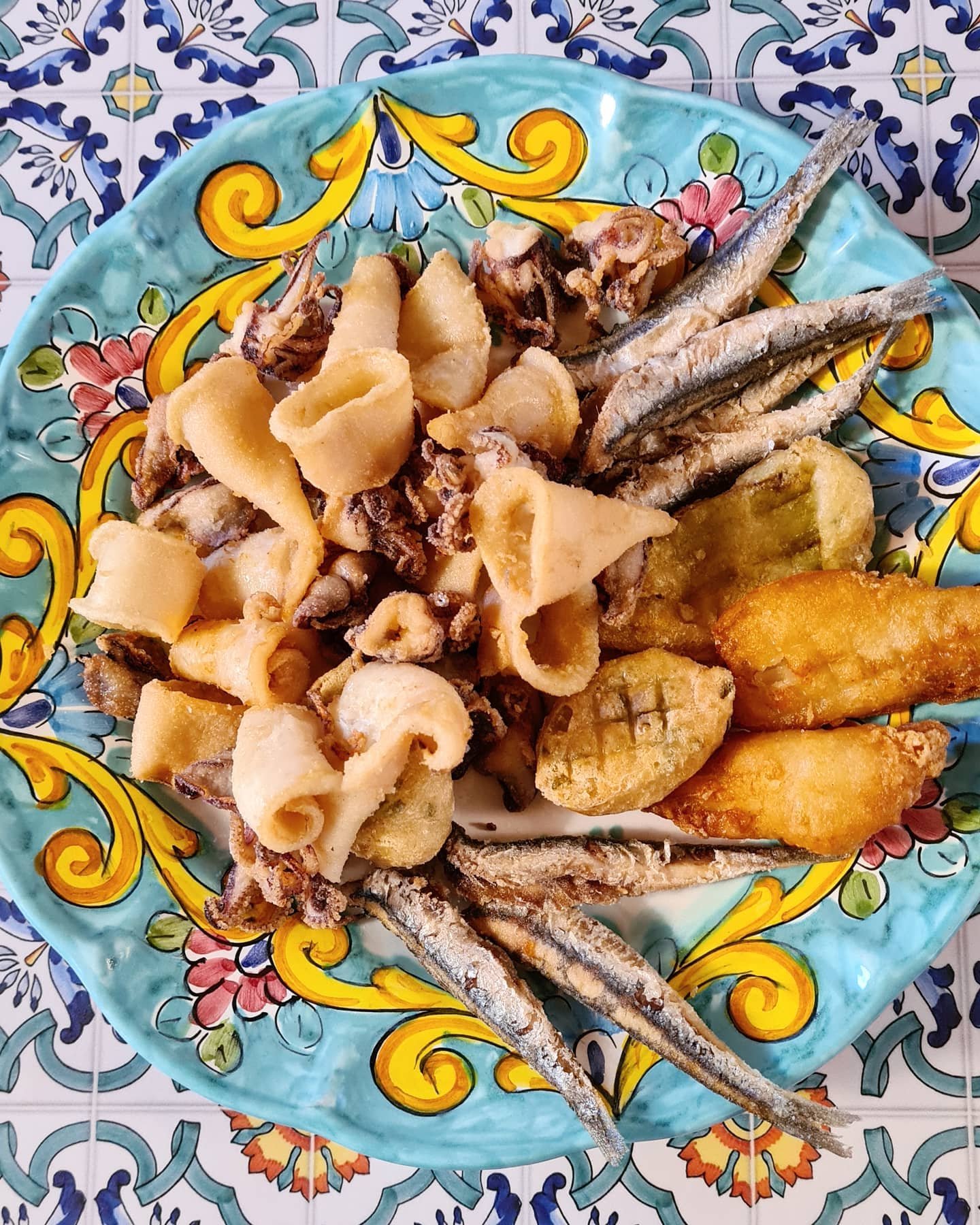 Calamaro fritto, zucchine alla scapece, ricotta alle erbe, sesamo tostato e olio al limone