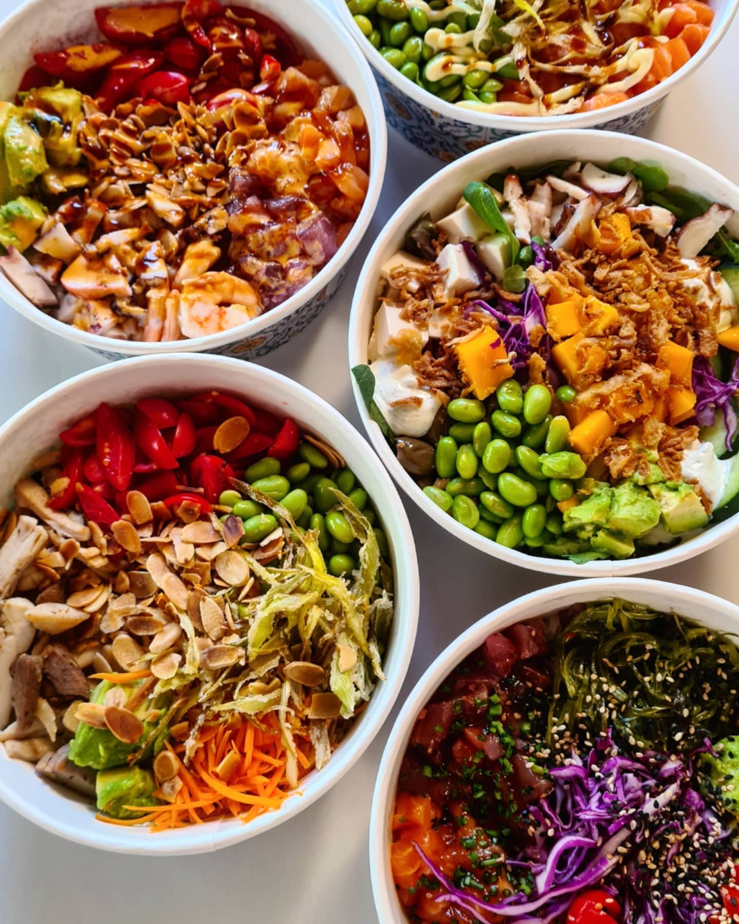 Riso bianco, avocado, datterino rosso, goma wakame, carote croccanti, arachidi tostate, sesamo e soya