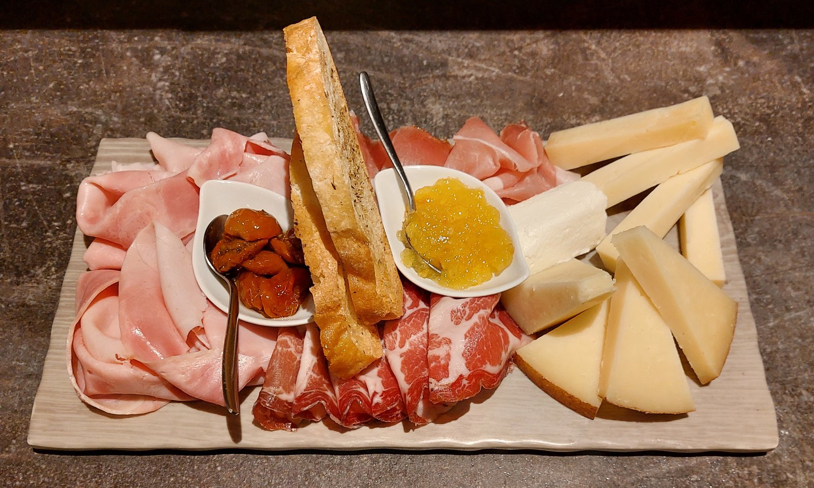 PROSCIUTTO DI PRAGA, COPPA, SPECK, CAPRINO, MONTASIO, PECORINO STAGIONATO, POMODORINI CONFIT, SALSA PICCANTE DI CLEMENTINE